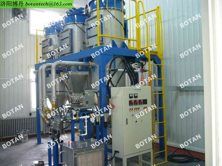 粗顆粒物料在交叉氣流的作用下,從控制環(huán)的壁片上滑落于粗料收集器中,而細粉則隨超細氣流分級機上方中部吸風(fēng)口的氣流輸送到下方微粉旋風(fēng)收集器中(分級筒的內(nèi)筒),這樣,原料即被分為粗細兩部分,而剩余的空氣則由下方中部吸風(fēng)口吸入,流經(jīng)葉片、噴射細粒環(huán)、控制環(huán),再從控制環(huán)周邊向超細氣流分級機上方中部吸風(fēng)口流回,形成周而復(fù)始的連續(xù)自動循環(huán)。跟隨物料帶入的多余空氣以及由于分級室溫度較高,空氣膨脹而多余的氣體則由余風(fēng)口排出,以保證分級室內(nèi)氣流平衡、穩(wěn)定。余風(fēng)口套裝一濾清布袋,使排出的空氣不致污染環(huán)境。